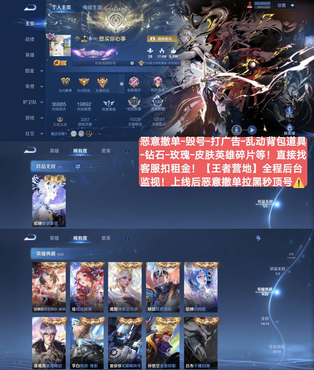 上不去看最后一张图游戏名字长租扫码上号无双贵族10,年限全满极736皮猴子无双无相,满珍品,11无双,10典藏,神威,炽阳神光,还有许多极品皮肤看图皮肤