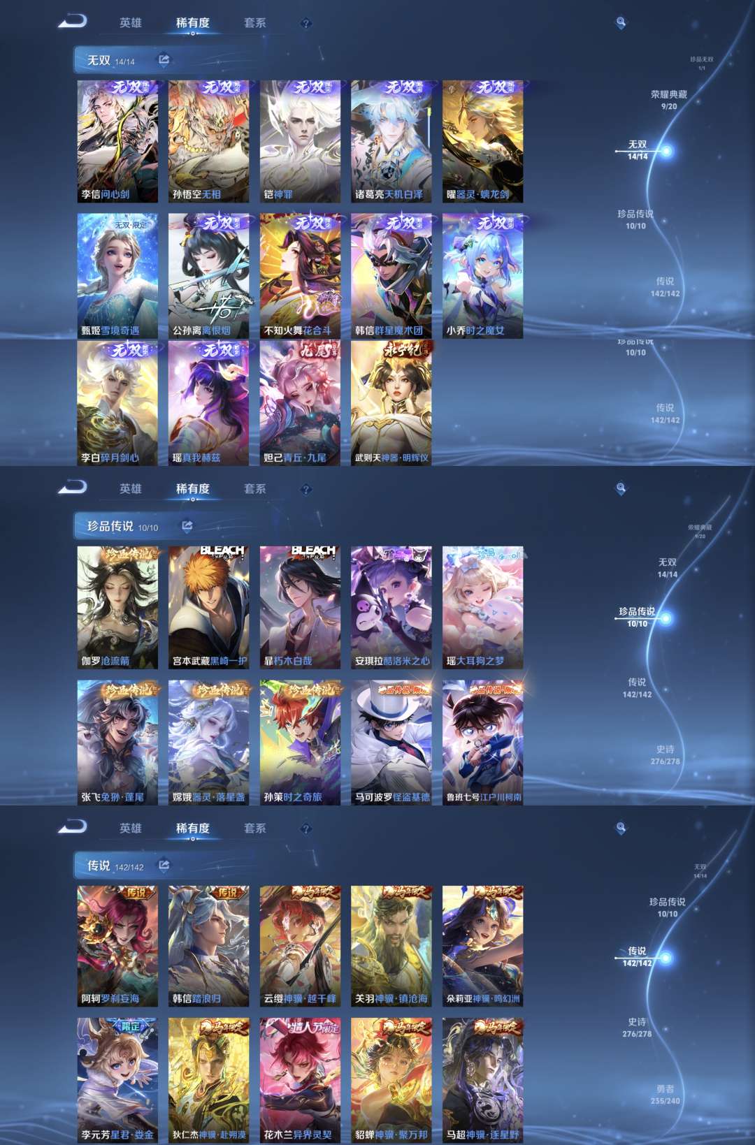 v10、537皮6水4无双、安琪拉-颠倒童话·魔镜、朵莉亚-神骥、遇见神鼓、齐天大圣、白虎志、韩信荣耀典藏、73传说、时之魔女、瑶无双、青丘、九尾、神器明辉仪