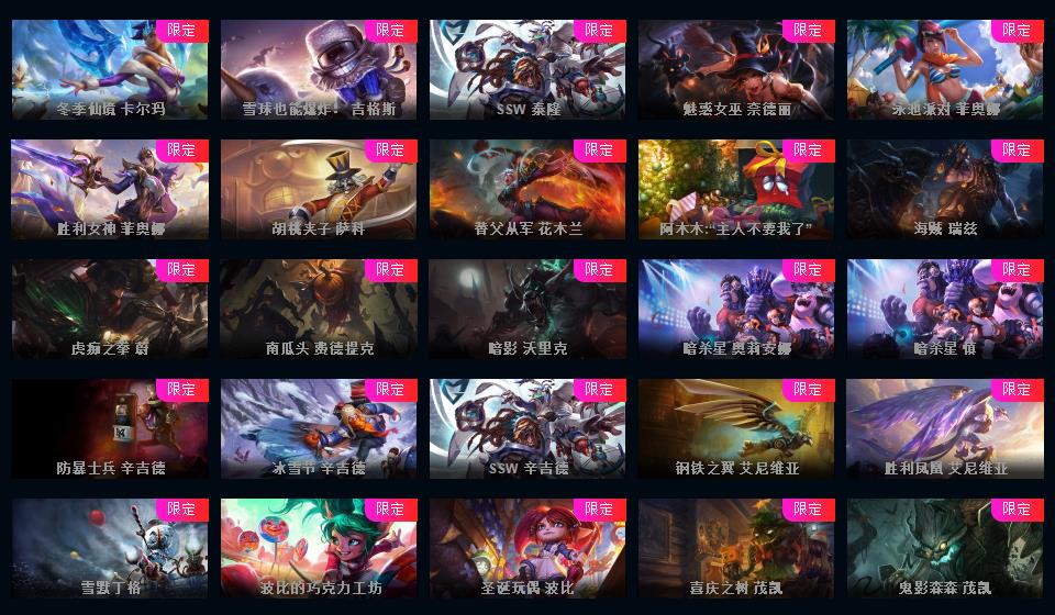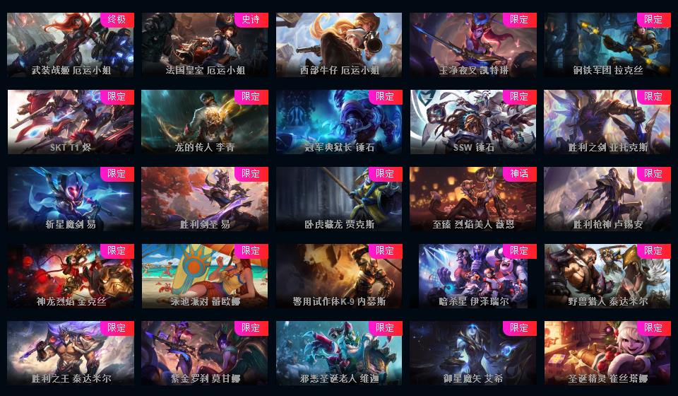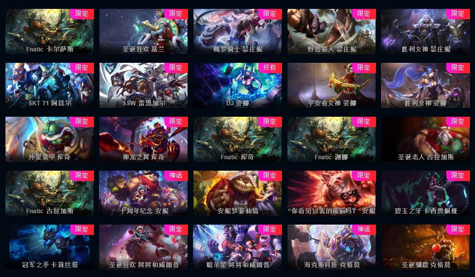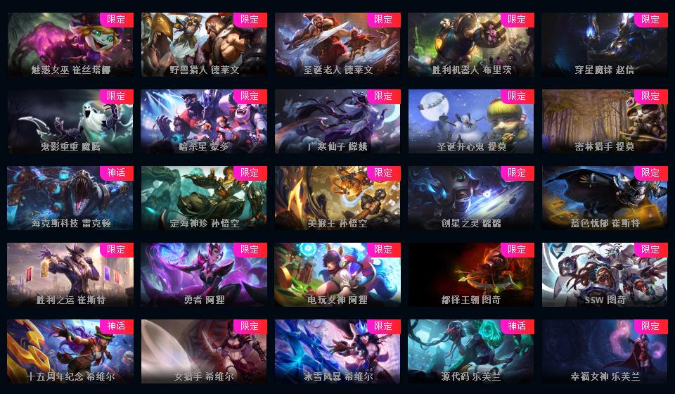 1000皮肤♥龙瞎♥海克斯摄魂VN人马♥送披萨的小姐姐全炫彩♥周年限定♥玉剑传说♥泳池电玩战队