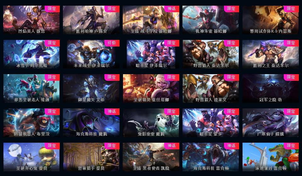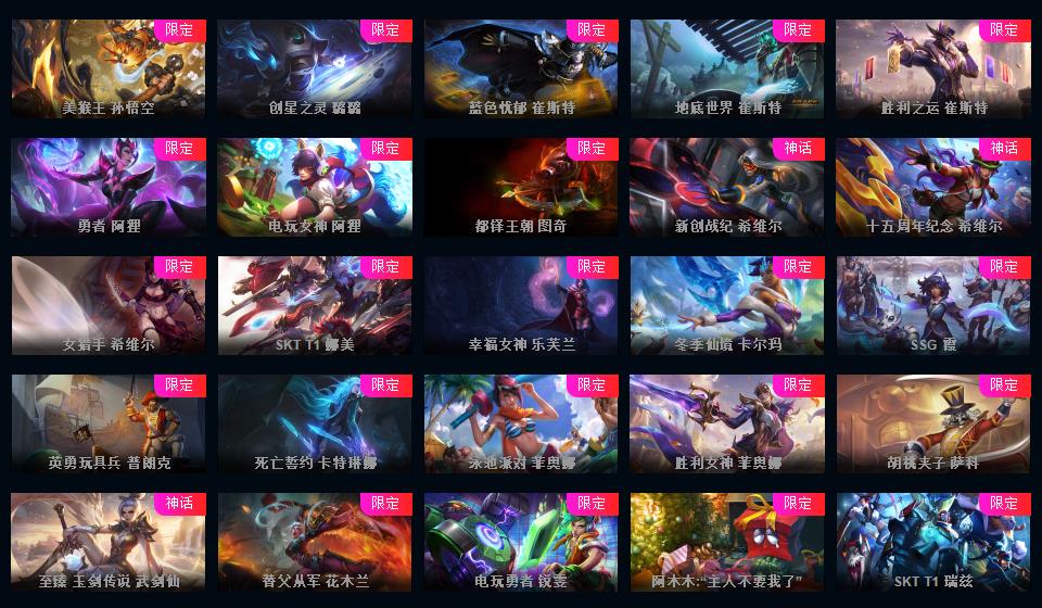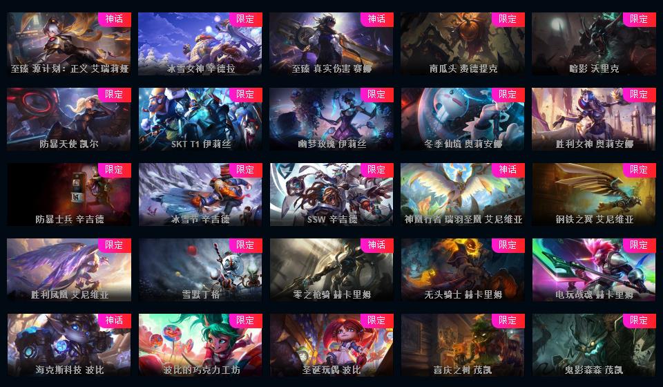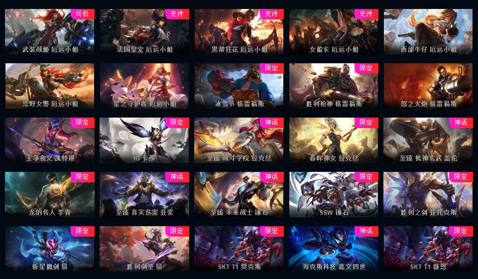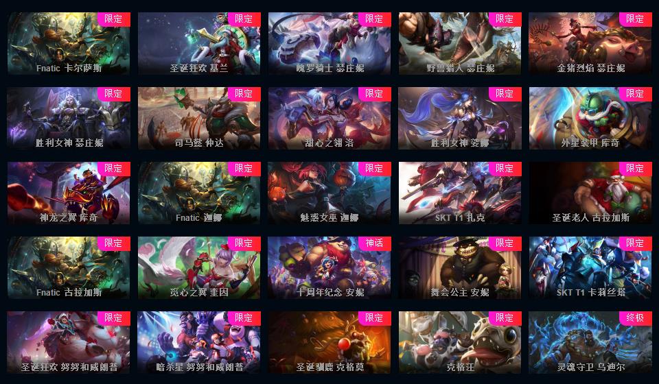 1000皮肤♥龙瞎♥海克斯摄魂VN人马♥送披萨的小姐姐全炫彩♥周年限定♥玉剑传说♥泳池电玩战队