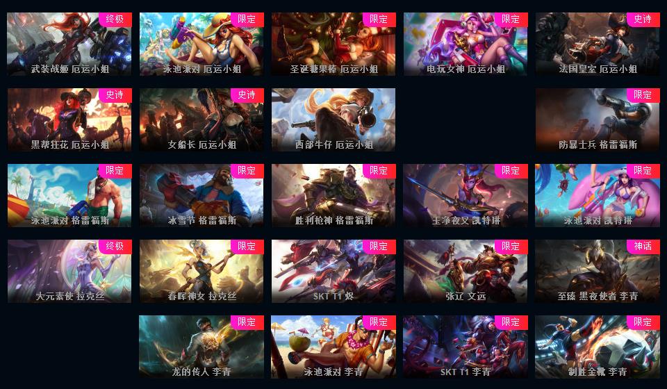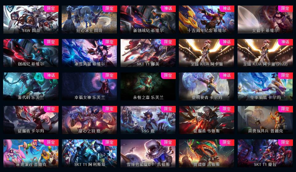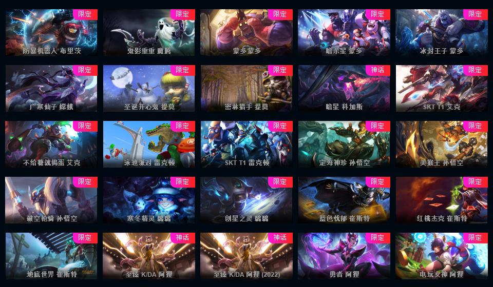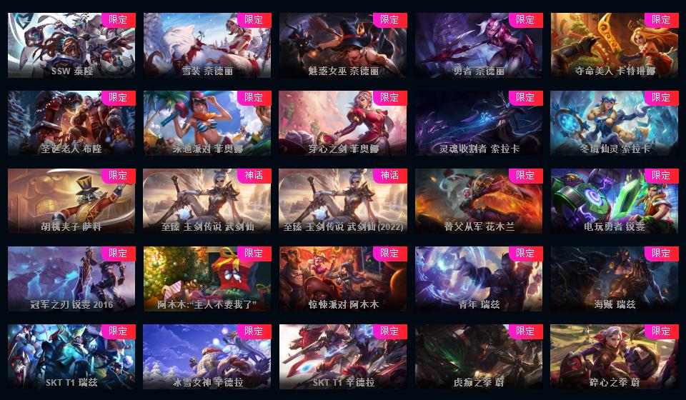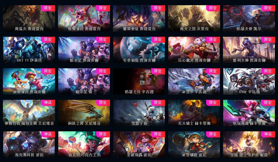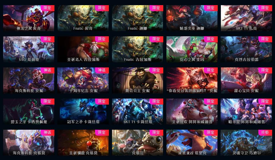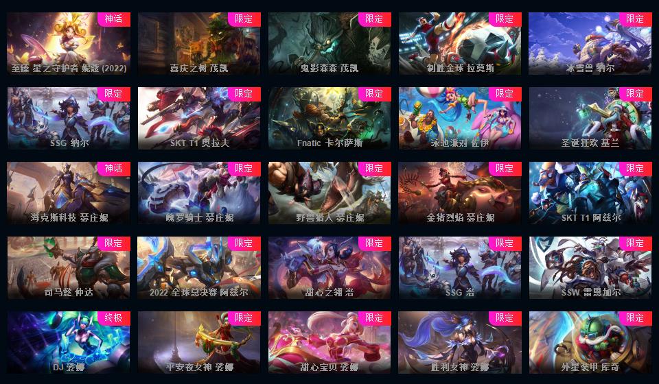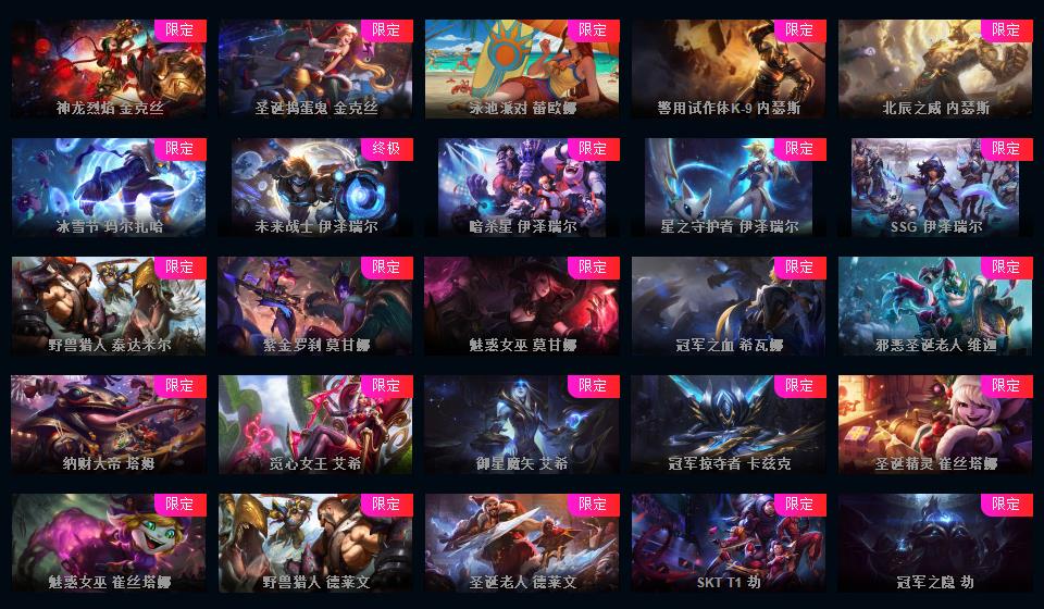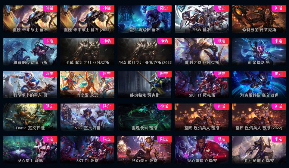 972原皮 532炫彩 12神话 18臻彩 云顶5神话卧龙之境剑魔李青胖胖龙菜大师 龙虾龙刀龙猴 新年限定 情人节 万圣节 冰雪节 电玩系列 源计划 泳池 电玩