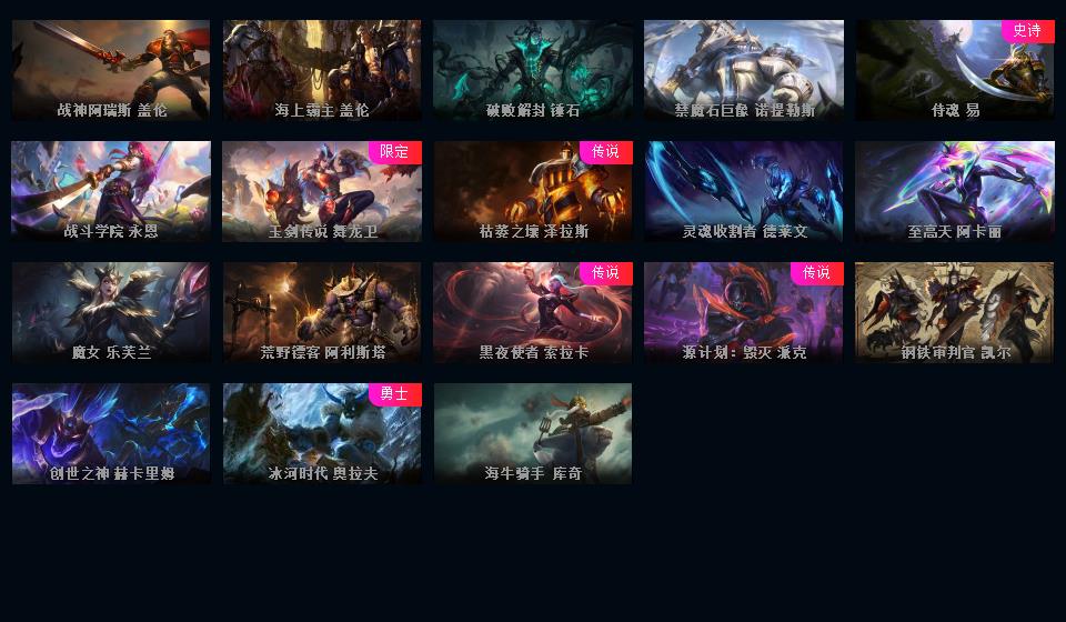 全部英雄 新款1000加皮肤 摄魂vn 龙虾 梦游仙境 龙刀 花木兰 电玩系列 情人节系列泳池派对系列 各种周年