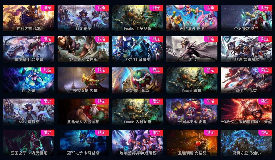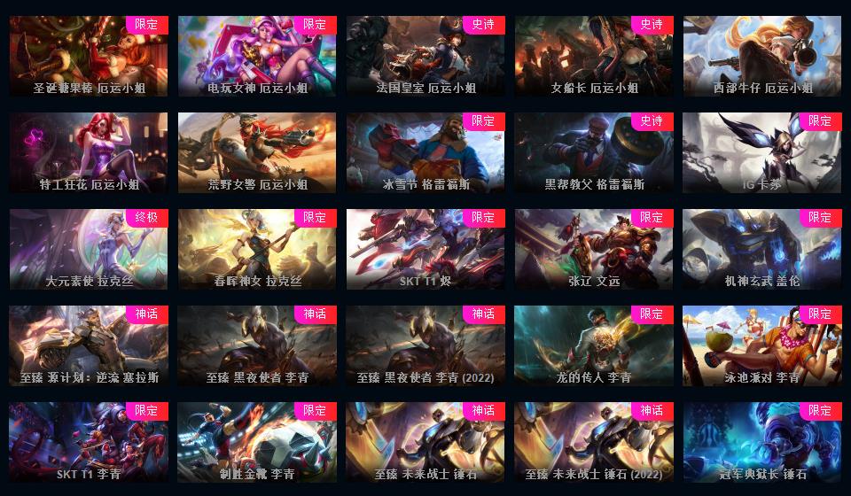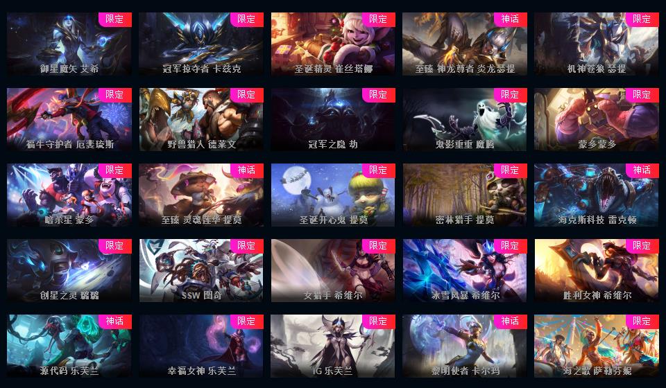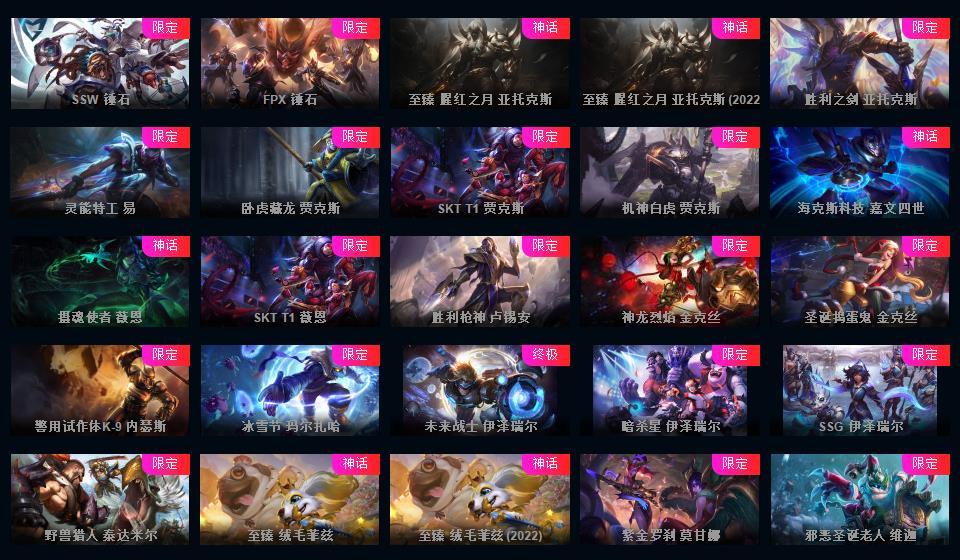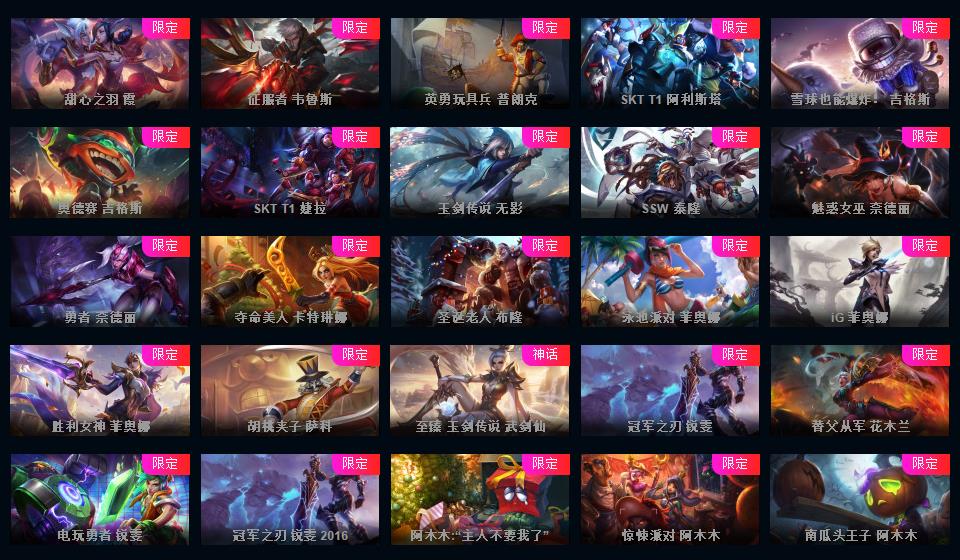 1000皮肤♥龙瞎♥海克斯摄魂VN人马♥送披萨的小姐姐全炫彩♥周年限定♥玉剑传说♥泳池电玩战队