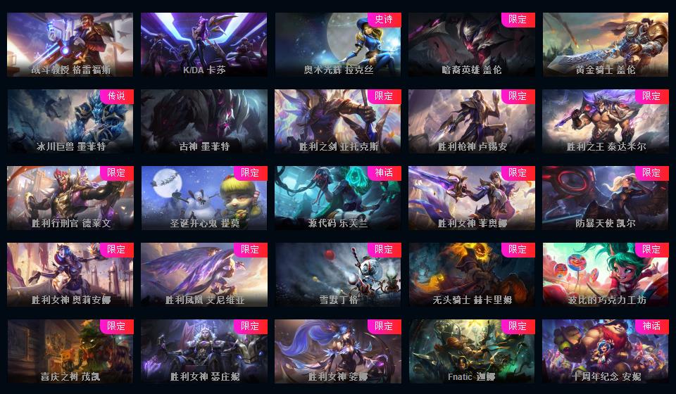 1000皮肤♥龙瞎♥海克斯摄魂VN人马♥送披萨的小姐姐全炫彩♥周年限定♥玉剑传说♥泳池电玩战队