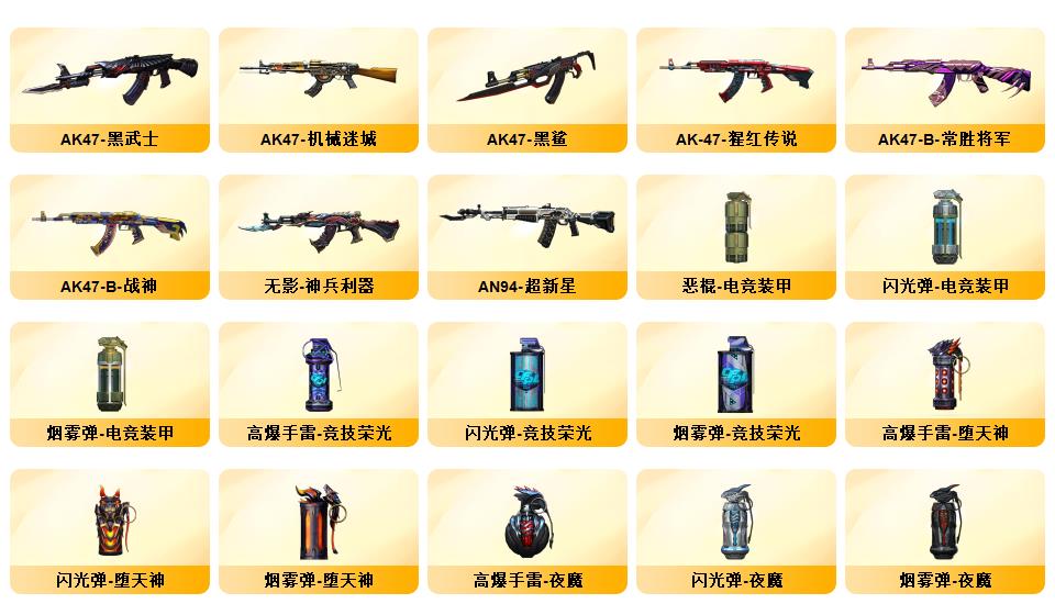 竞技荣光+QBZ+COP-雷霆*2+柯尔特-竞技荣光*3+USP雷暴*1+12套雷+音效卡(火麒麟+雷神+毁灭+黑骑士)+套装(竞技荣光套)