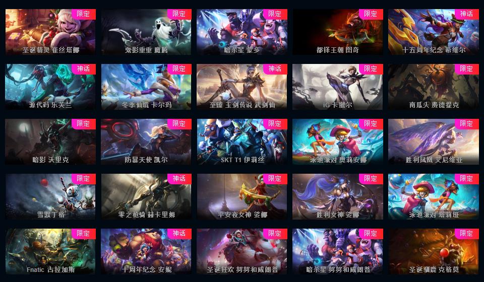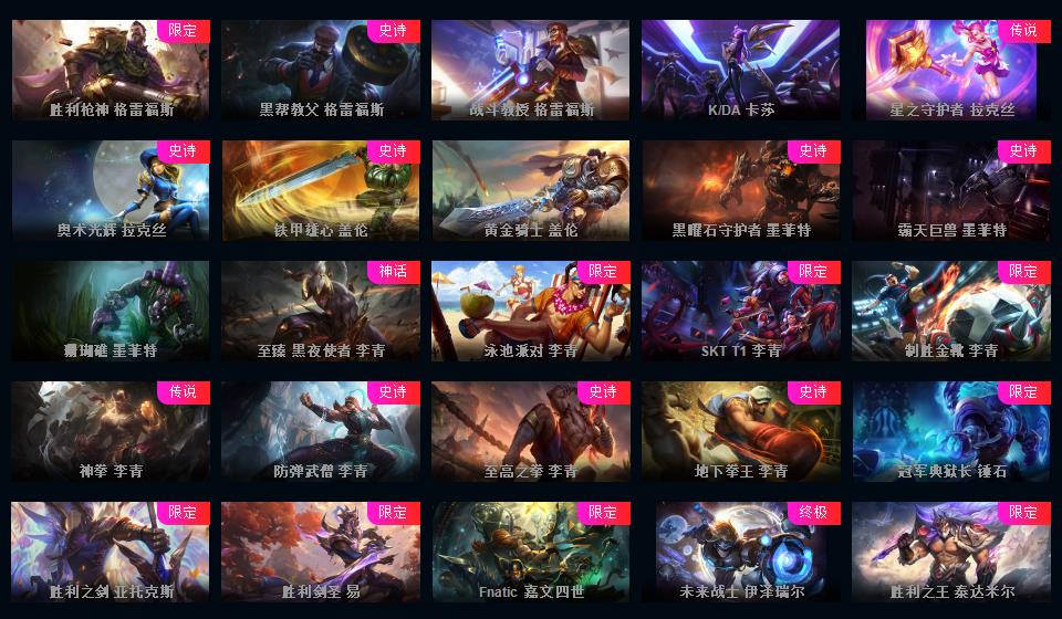 峡谷707原皮 487炫彩 54神话18臻彩 云顶4神话至臻龙的传人李青青花瓷拉克丝兔年棋盘 金克斯李青亚索特殊炫彩新神话多 冰雪节一套 源计划一套玉剑传说泳池
