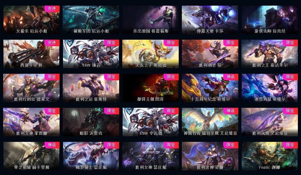 峡谷707原皮 487炫彩 54神话18臻彩 云顶4神话至臻龙的传人李青青花瓷拉克丝兔年棋盘 金克斯李青亚索特殊炫彩新神话多 冰雪节一套 源计划一套玉剑传说泳池